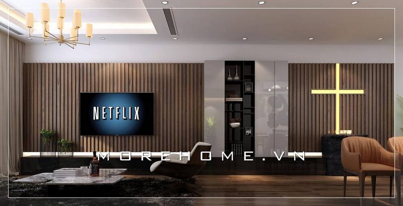 Trang trí không gian nội thất phòng khách ấn tượng với chất liệu gỗ ốp tường trang trí.